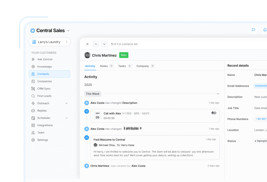 Central comes with a free CRM that automatically captures caller details, notes, and follow-ups. Everything stays organized in one place, so you can manage leads without paying for extra software.