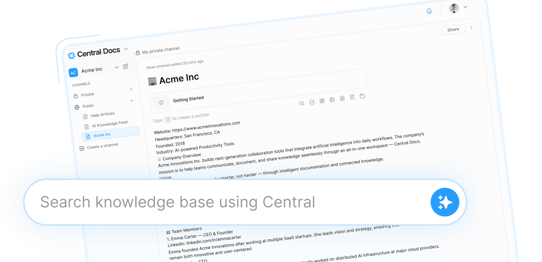 Just drop in a URL or upload docs — Central builds a smart knowledge base that answers FAQs like a seasoned employee.