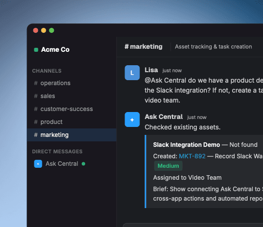 Both. Use DMs for private tasks — drafting emails, checking your calendar, reviewing your pipeline. Add Ask Central to team channels for collaborative tasks — creating issues, summarising threads, assigning follow-ups.