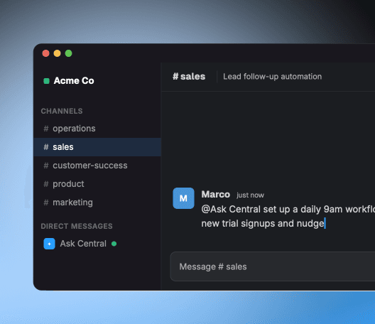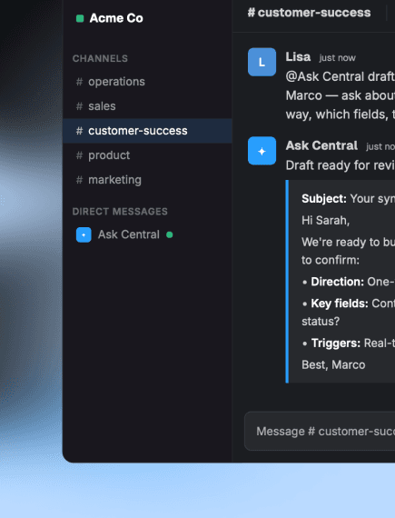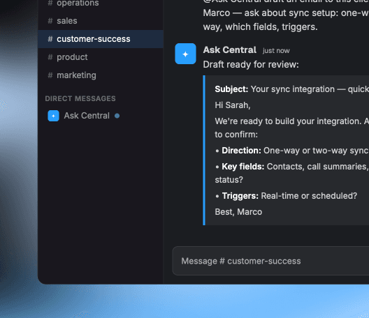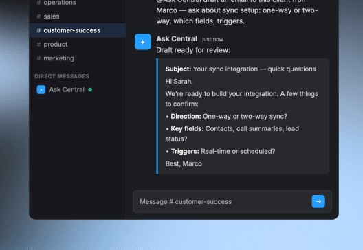 You manage your business across a dozen tools, a hundred tabs, and zero free time. Ask Central collapses all of it into one Slack message — with full context of your CRM, calls, inbox, pipeline, and 160+ apps.
