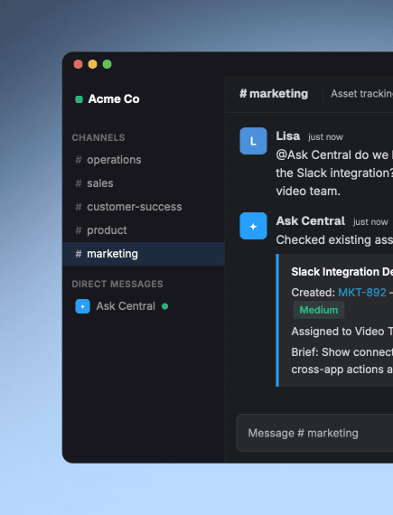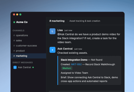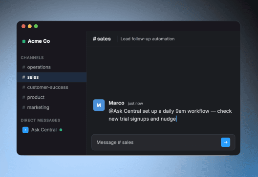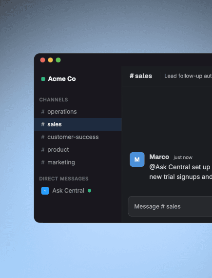 Ask Central is free with every plan. No credit card required. One prompt in Slack is all it takes to see what your business looks like when everything works together.