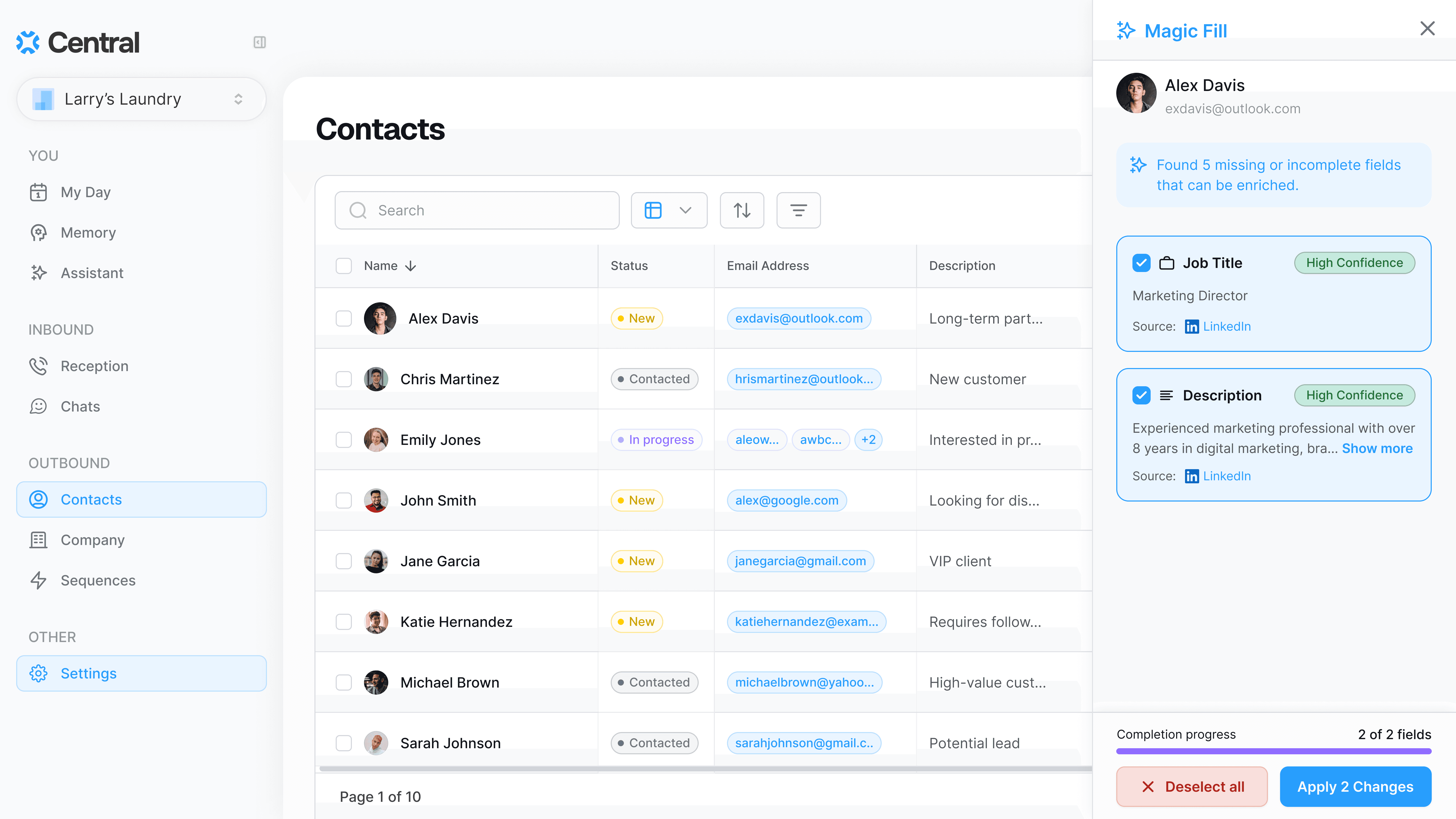 Central scans LinkedIn, company databases, and public sources to auto-fill contact details