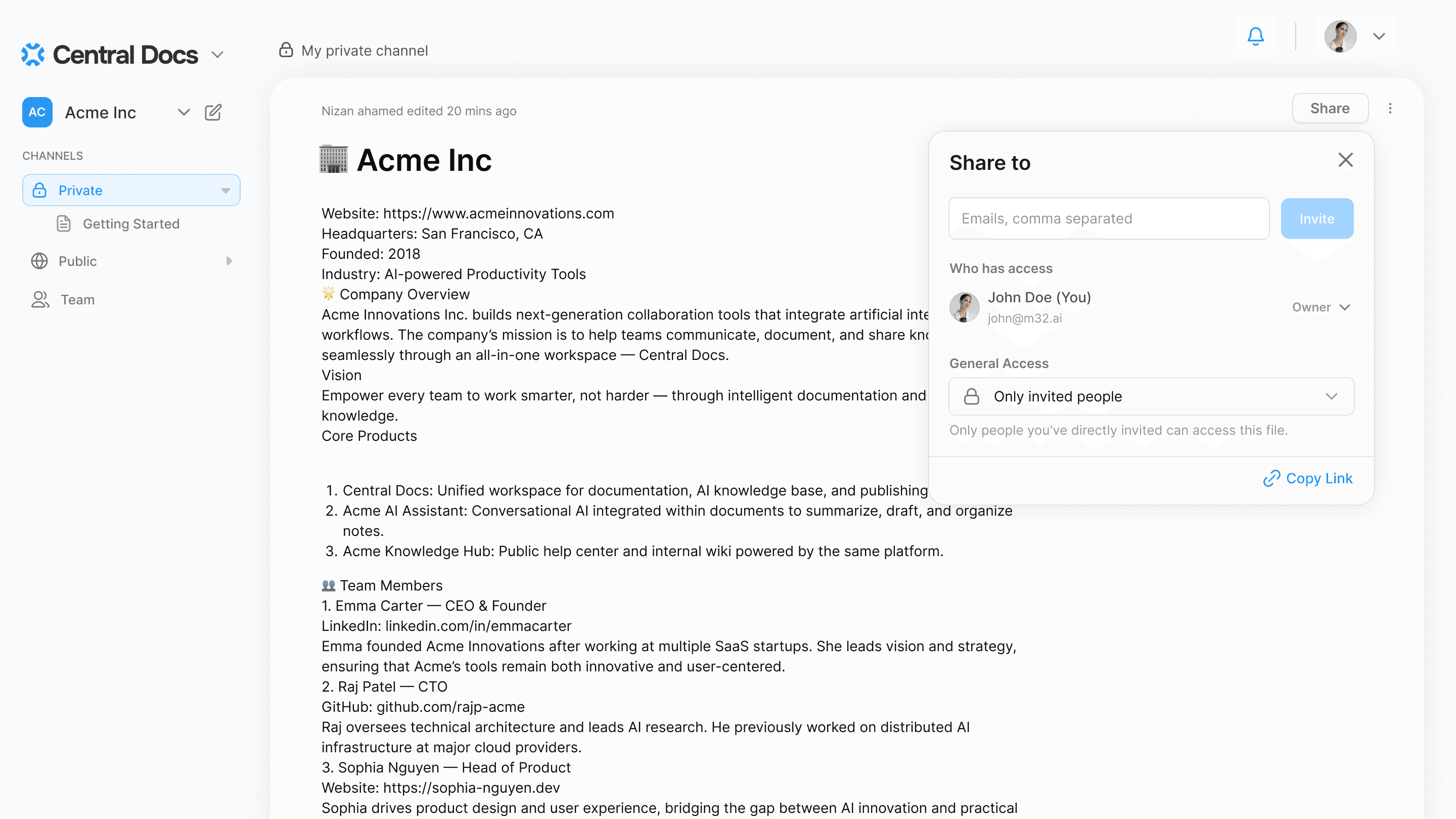 Share docs publicly with a custom subdomain or keep them private for your team only.