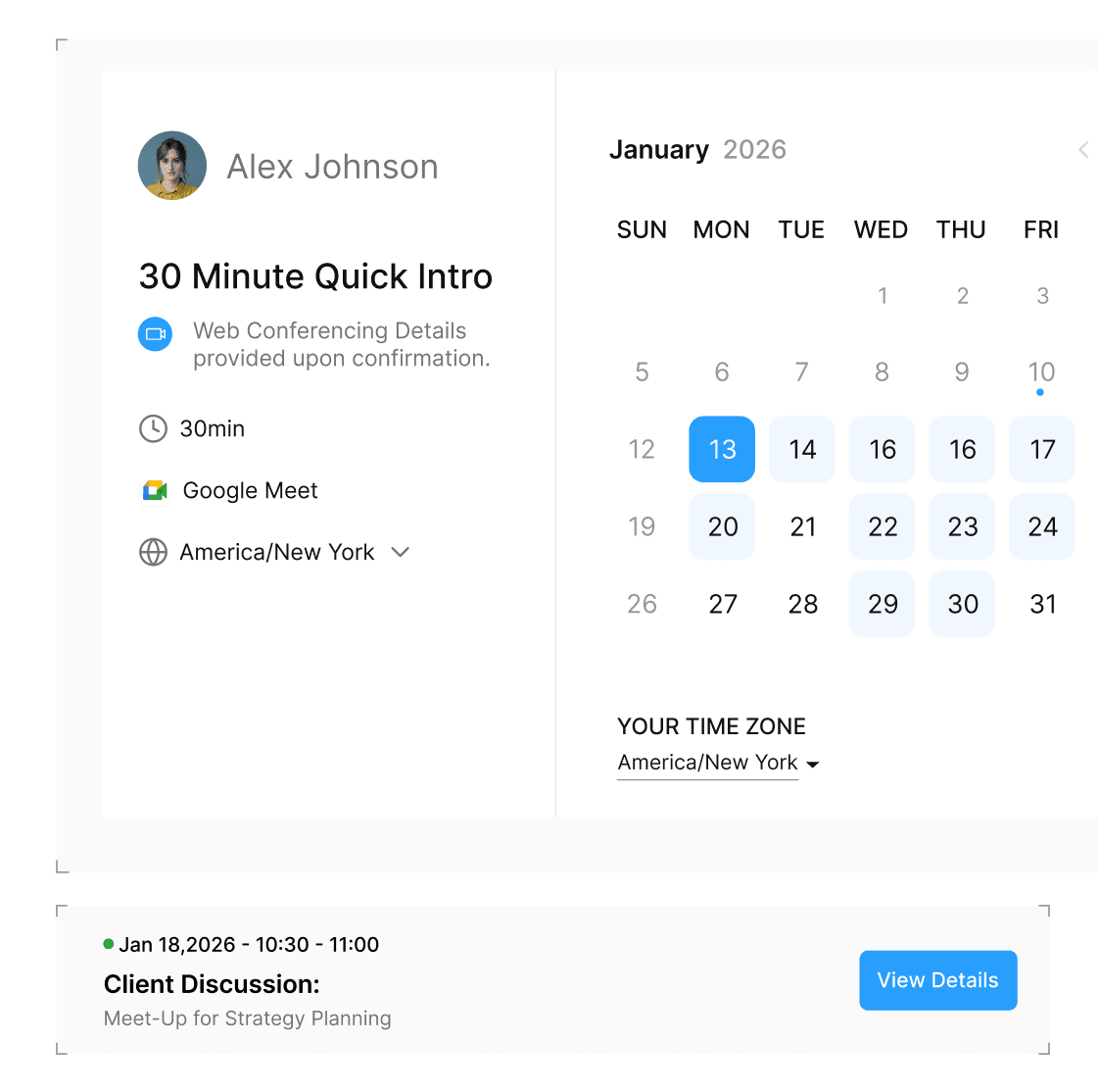 Send your scheduling link via email, embed on your website, or share in chats — clients book instantly.