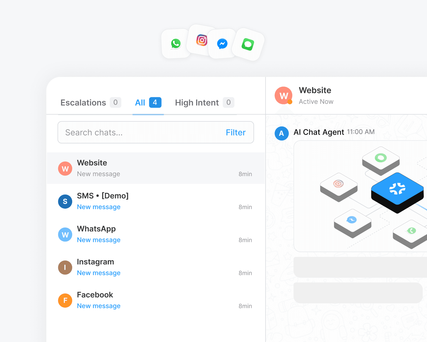 Email, chat, SMS, and social all land in one view. No conversation gets missed because it came in through the wrong channel.