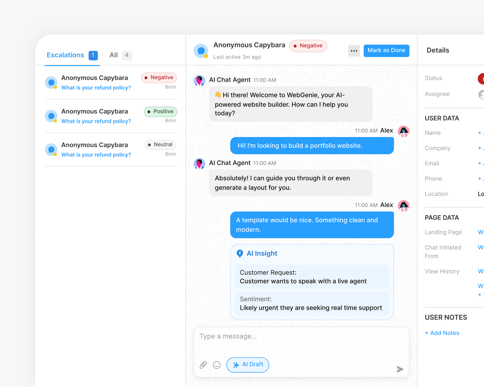 Knows when a conversation needs a human and hands it off. The history comes with it - customers never repeat themselves.